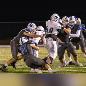 Western senior defensive end Al Schram (51) tackles a Corsairs’ ball carrier. Schram would recover a fumble to set up Western’s first score. PHOTO by Teresa Presty.