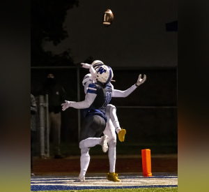 Western defensive back Carson Barringer (11) breaks up a pass in the end zone in the Warriors’ 14-13 playoff win over Mott. PHOTO by Teresa Presty.
